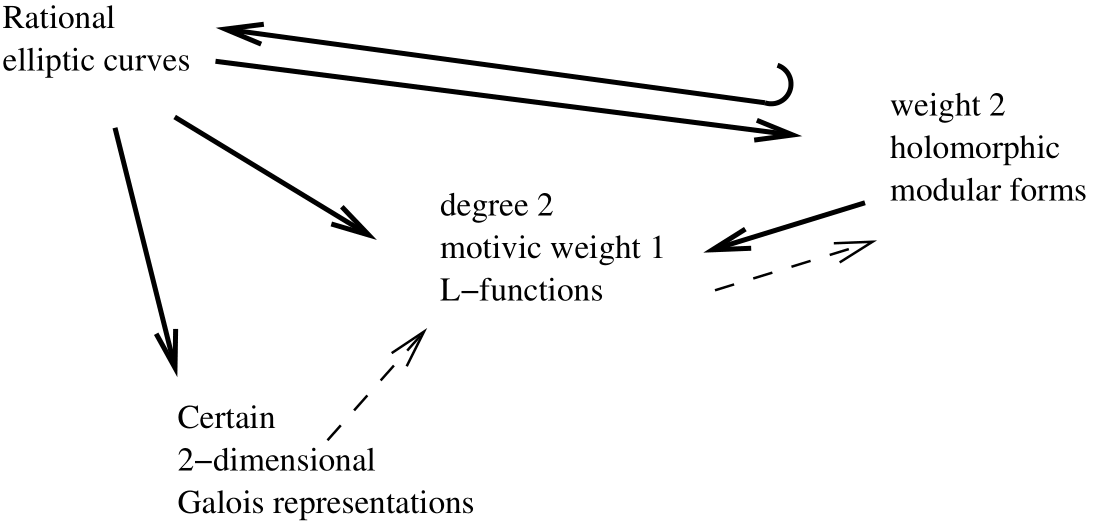 The story is even richer: there are other types of objects which have $L$-functions, two of which are called modular forms and Galois representations. We can represent these relationships with a diagram:
