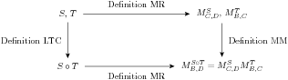 Theorem MRCLT (Matrix Representation of a Composition of Linear Transformations) Suppose that $\ltdefn{T}{U}{V}$ and $\ltdefn{S}{V}{W}$ are linear transformations, $B$ is a basis of $U$, $C$ is a basis of $V$, and $D$ is a basis of $W$. Then \begin{equation*} \matrixrep{\compose{S}{T}}{B}{D}=\matrixrep{S}{C}{D}\matrixrep{T}{B}{C} \end{equation*}