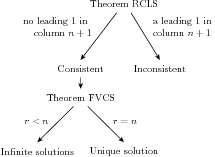 Theorem RCLS (Recognizing Consistency of a Linear System) Suppose $A$ is the augmented matrix of a system of linear equations with $n$ variables. Suppose also that $B$ is a row-equivalent matrix in reduced row-echelon form with $r$ nonzero rows. Then the system of equations is inconsistent if and only if the leading 1 of row $r$ is located in column $n+1$ of $B$.