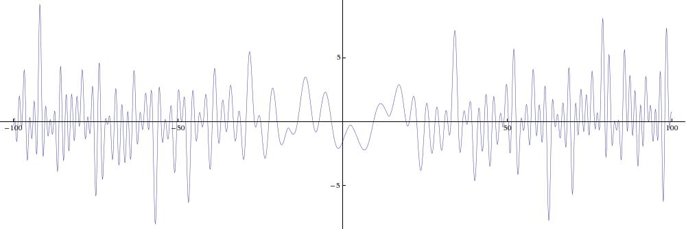 Any other place with a positive local minimum or a negative local maximum would indicate a violation of the Riemann Hypothesis! The plot may appear to show such a problem near t=-49 and near t=93, but a numerical calculation (courtesy of Michael Rubinstein) finds that Z(-48.9)=-0.0294467 and Z(92.9)=-0.0175431.