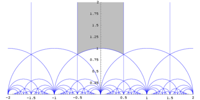 in the upper half-plane. This is the shaded region in the picture below. The picture above shows a different (but equivalent) fundamental domain. It was chosen because in the usual fundamental domain the points near the cusp at infinity are very far from the bulk of the points (in the Euclidean metric). But if you would like to see the above picture transformed into the standard fundamental domain, just scan down the left edge of this webpage. The upper half-plane tiled by fundamental domains for SL(2,Z):