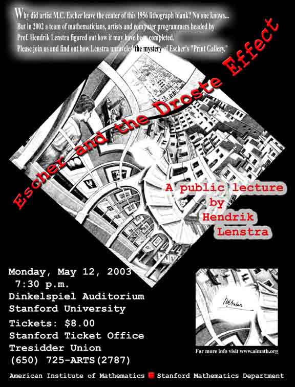 M.C. Escher, the graphic artist famous for mathematical patterns and optical illusions, left a blank spot in the middle of his 1956 lithograph, "Print Gallery". Escher signed his name there, instead of completing the center of this picture of curved and whirling buildings. In 2002, a team of mathematicians, computer programmers, and artists used techniques from advanced mathematics to figure out how Escher might have completed the picture. The team was led by Hendrik Lenstra, who will reveal the secrets behind the mysterious blank space during the 2003 AIM-Stanford Public Lecture. The lecture will take place on Monday, May 12, at 7:30 pm in the Dinkelspiel Auditorium on the Stanford University campus. The presentation and explanation of the mystery will include a number of beautiful images and animations.